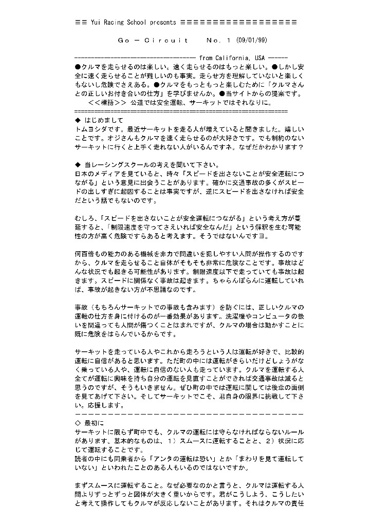 最近トム ヨシダのブログをユイレーシングスクールに転移するにあたり資料を調べていると、1999年9月1日に発行したユイレーシングスクールのメールマガジン、”Go Circuit”の創刊第1号のデータが出てきました。