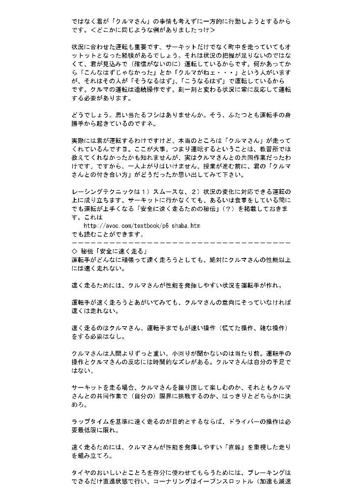 そして。情報を集めるだけでなくこちらからも情報を発信しようメールマガジンの発行を思いついたのです。とにかくサーキットを走るにあたって「奥まで突っ込めば速く走れる」、「足は固めなければサーキットは走れない」など、蔓延している危うい風潮を払拭するのが自分の役割だと信じていました。