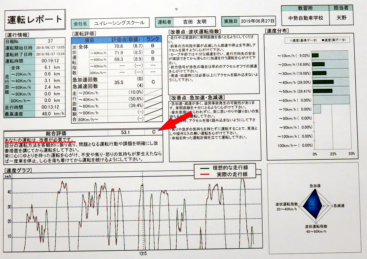 1回目の走行が終わり教室で待っていると、この日担当してくれた教習主任の天野さんがグラフを持って来て「 こんな感じですね 」。数字やグラフがならんでいるけど、その中に総合評価の項目があって、