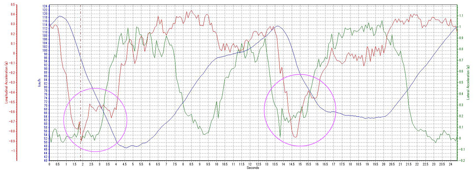 17.0~20.0秒:減速Gはほぼゼロなのに走行抵抗で車速が低下(スロットルをもっと開けるべきだったかな)
