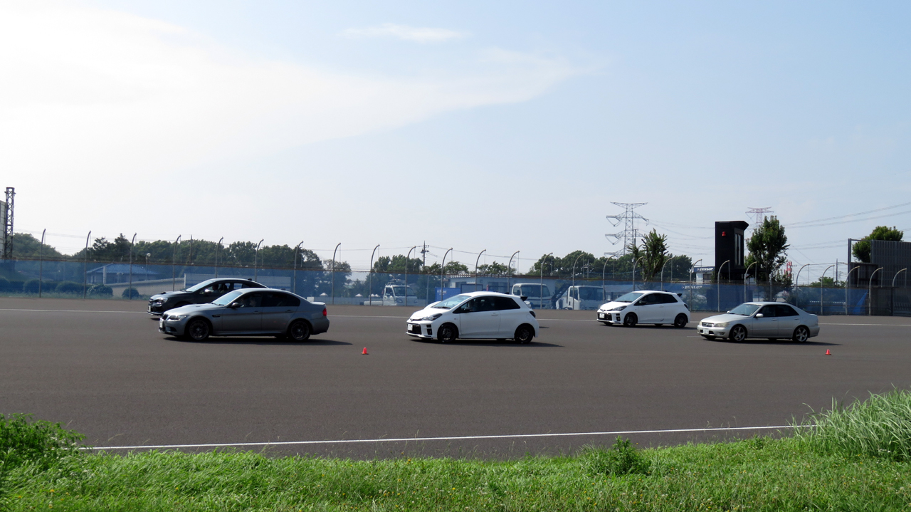 386回で紹介した筑波サーキットにあるビッグオーバル。本来ならば2016年4月と同じフォーマットで開催したかったのだけど管理者である公益財団法人JKAから30m走路の内側部分を使わないようにとの要請があった。とは言うものの、広い場所があればドライビングスクールでもスクールレースでもやってしまうユイレーシングスクールのことだから、今回は外側部分をい使って開催することにした。パイロンで仕切ったコーナーの半径が65.3m。外側の白線までが17.3m。十分広い。中心線で測って1周636.7mのビッグオーバル。アウトインアウトで走ればこれくらい。