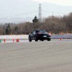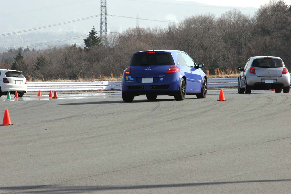 次に、ヒールアンドトウを使うとどんなメリットがあるのかを説明し、その目的からさかのぼってブレーキング中のどの時点でシフトダウンすることが好ましいか確認してもらった。最後に、実際にヒールアンドトウの操作をする時のコツを「止まっているクルマのシートを一番後ろに下げ」て右足の動きを見てもらいながらイメージしてもらった。