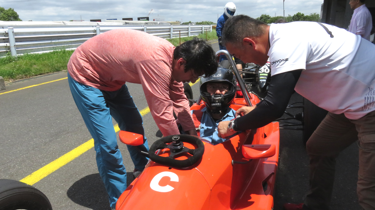 午前中のプログラムが進み、いよいよ自分が乗る順番に。両足を何とか収め、両肩まで収めると、四方八方から手が伸びてきて4点式のシートベルトで締め上げられます。ハコ車では下ろさなかったヘルメットのシールドも下ろすように言われました。すべてが初めての体験。フォーミュラカーってやっぱりすごいんだな…