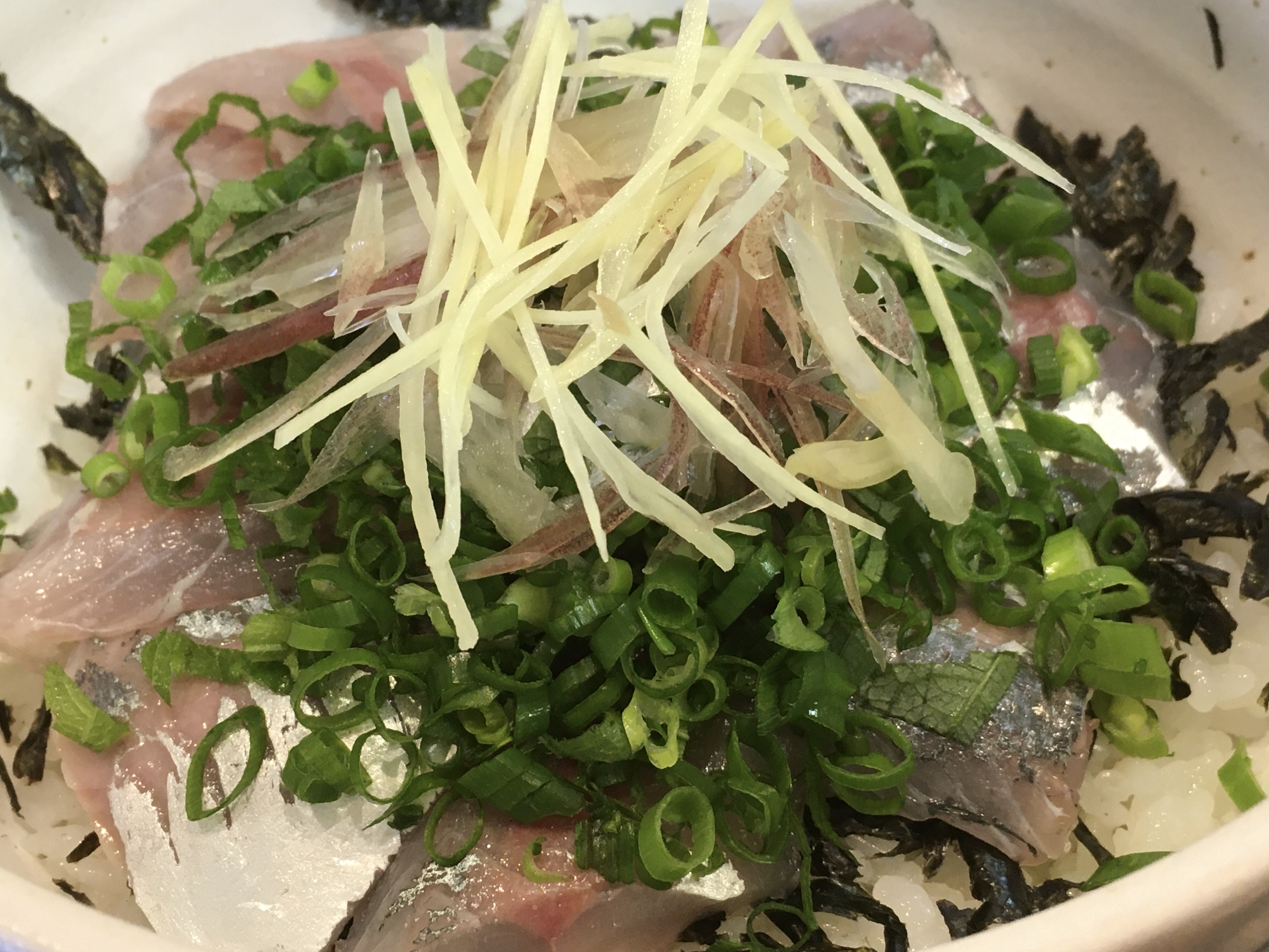 肉厚のアジの上に刻んだ大葉と茗荷が乗っていてその上に針生姜