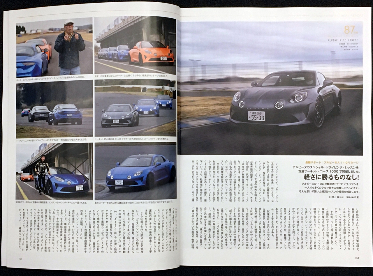 昨日届いたエンジン243号に早くもALPINE x ENGINE ドライビングレッスンのレポートが載っていた。村上編集長が参加者のアンケートを紹介しているけど、その中のひとつに 『サスペンションの動きがしなやかで、荷重移動、特にアクセル・オフやブレーキング時、ブレーキをゆっくり抜いて少し残す時の挙動が非常にわかりやすかった』 とあった。