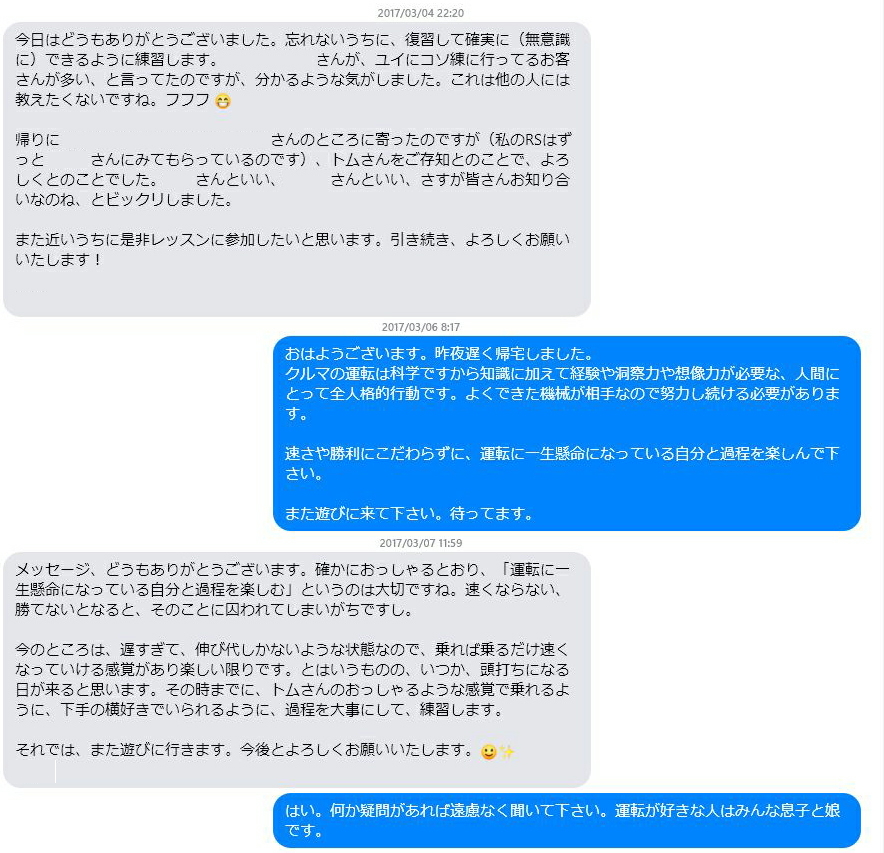 過去にYRSオーバルスクールに参加してくれたYさんとのやりとりを載せるのを承諾してもらって。 Yさんはクルマの運転を全開で楽しみ中。