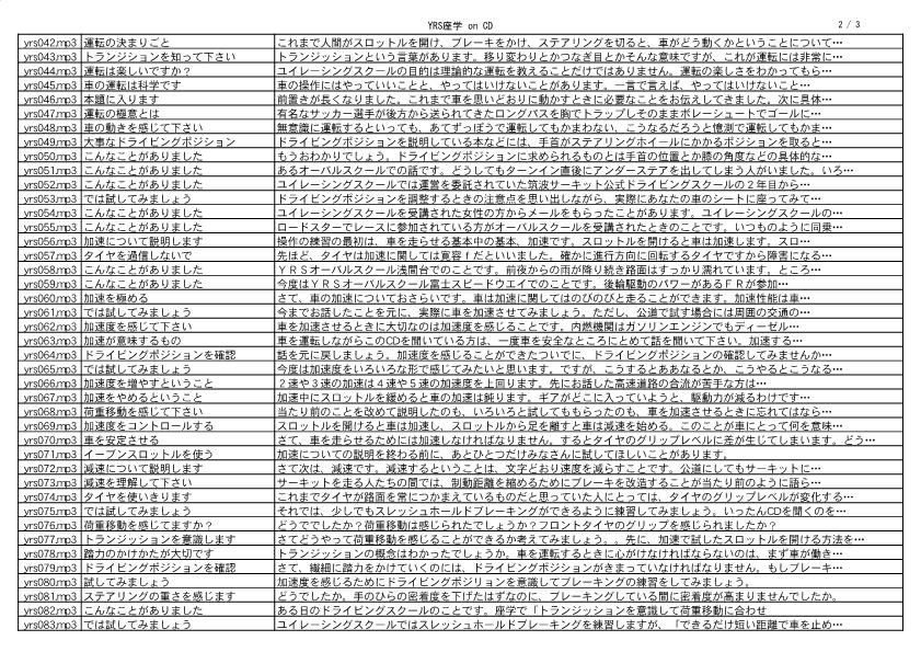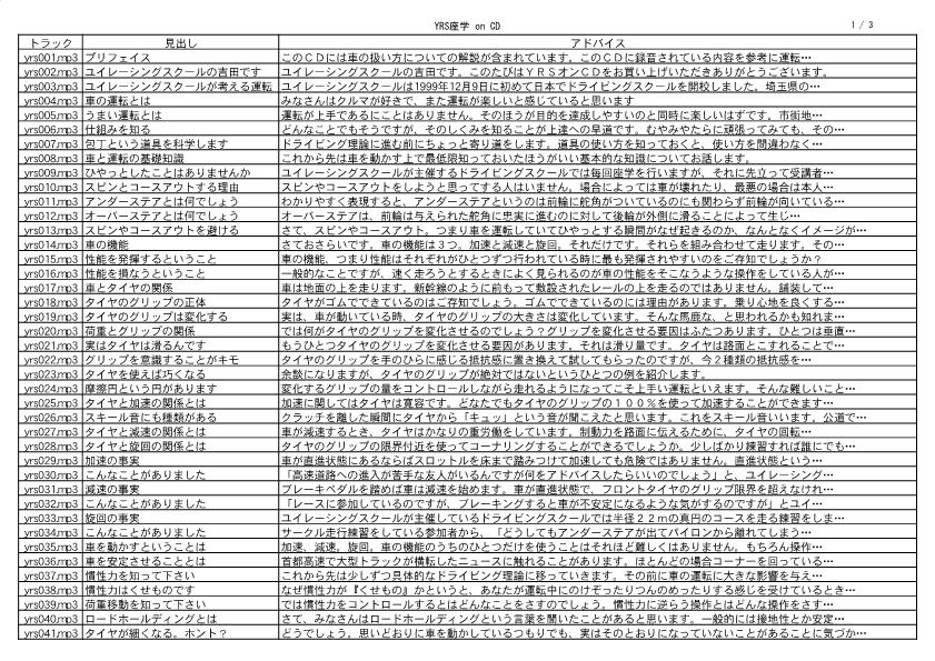 ぜひYRS CDを聞いてみて下さい。ユイレーシングスクールの座学とスクールでのアドバイスを集約して収録した音声CDです。実際にスクールを受講しなくても、ご自身のクルマを題材に自習できるような内容になっています。録音時間5時間半のCDはクルマの運転を間違いなく次のステップに導きます。