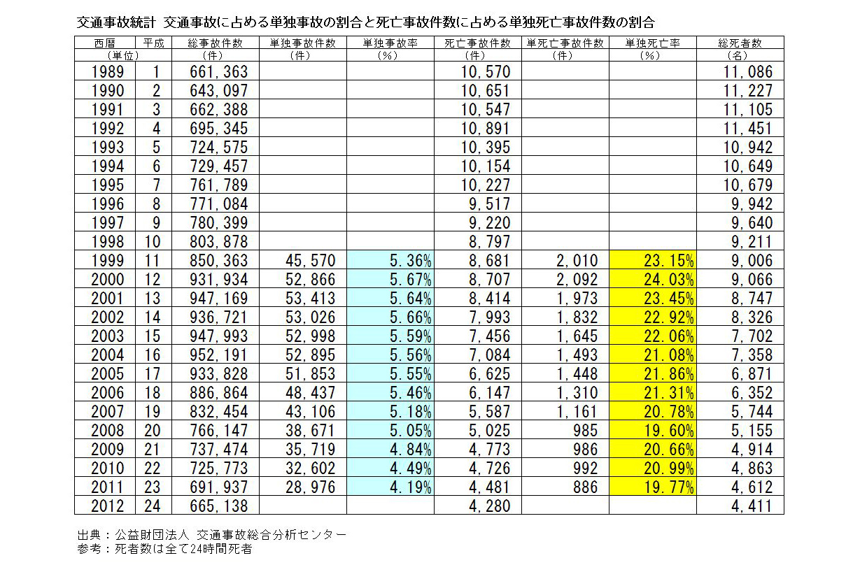 上の表には23年までの数字しかないが、ここ数年20%前後で推移していた全国の単独事故死者数よりかなり多い。理由がなんであれ相手のいない単独事故は、防ごうと思えば防げるはずなのだから、滋賀県に住む人間としてはいささか残念な数字ではある。