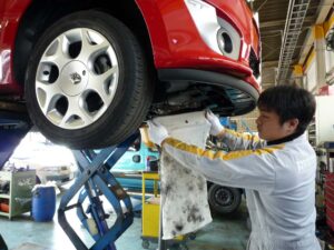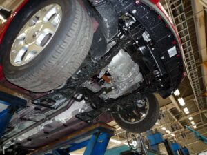 リフトアップされた相棒を下から見せてもらう。もちろん工場の許可を得た上でだ。
