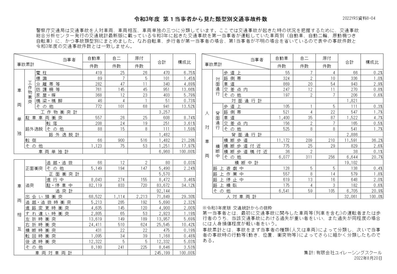 ここでは令和3年度にクルマと2輪車の交通事故がどのような状況で起きたかを知る手がかりとして、交通統計から引用した数字をまとめてみた。参考になるかどうかわからないがご覧いただければと思う。