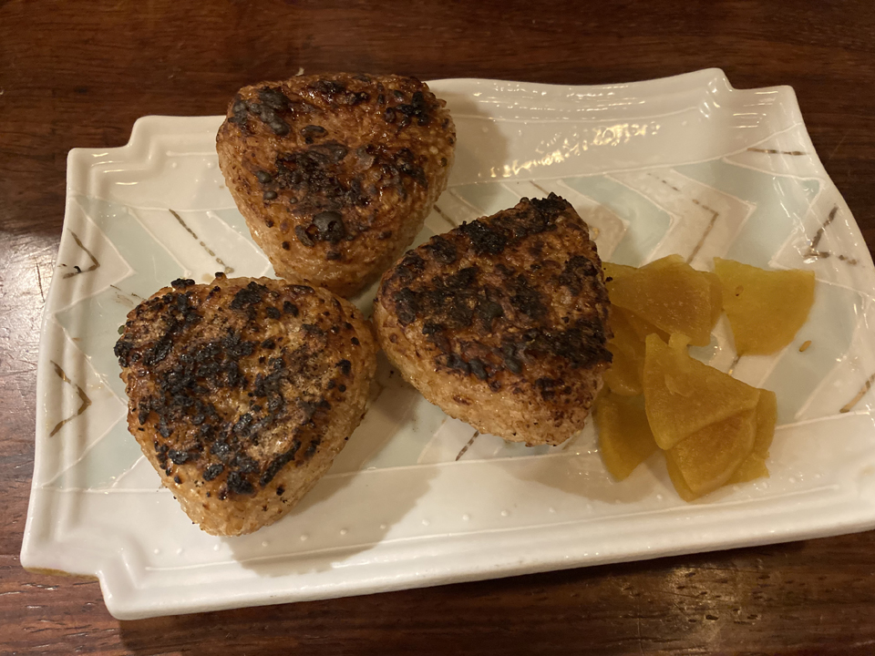 〆は醤油の焦げた香り立つ焼きおにぎり