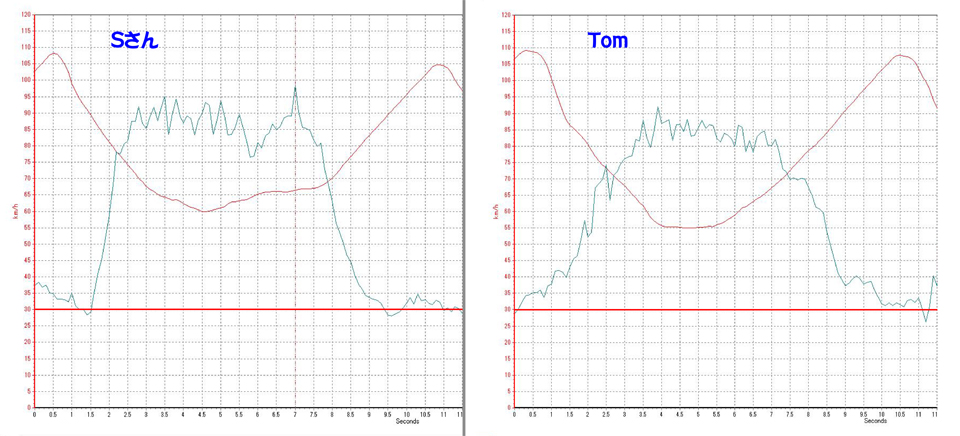 ・結果として下のコーナーのボトムスピードは60キロ対55キロでSさんの方が速い。Sさんの場合スタート後4.5秒あたりで1瞬60キロになってから速度が上昇を始めるけれど、ボクの場合はスタート後4秒あたりから約1.5秒の間55キロを維持している。