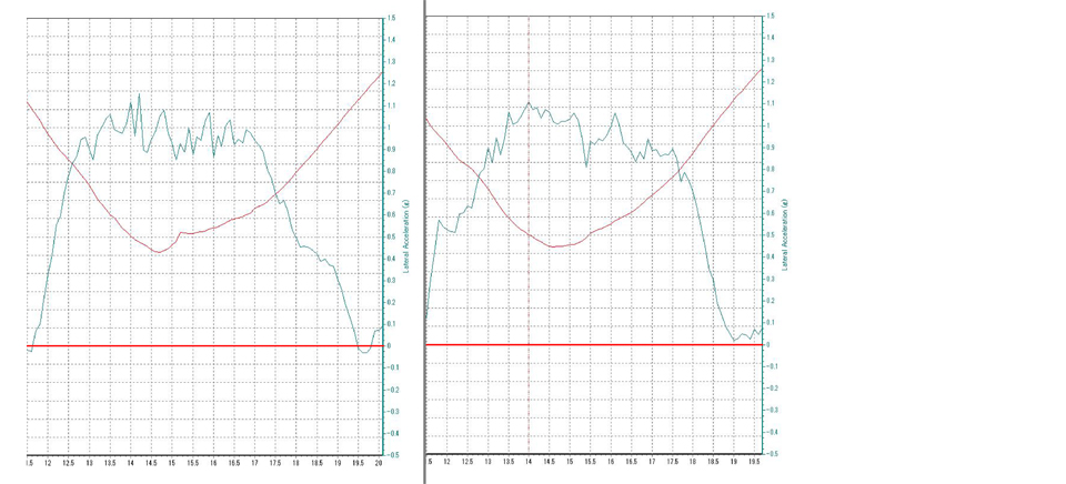 ・そこから上のコーナーへのアプローチが始まるのだけど、ターンイン手前でSさんが強いブレーキングをしていないのが見てとれる。対してボクは1瞬だけだけどマイナス0.9G付近までしっかりと減速している。