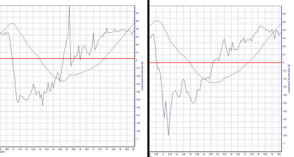 下の図は比較しやすいように1周のラップをスタート後10秒で2分割して並べた。図中の赤い横線が減速Gゼロを示す。