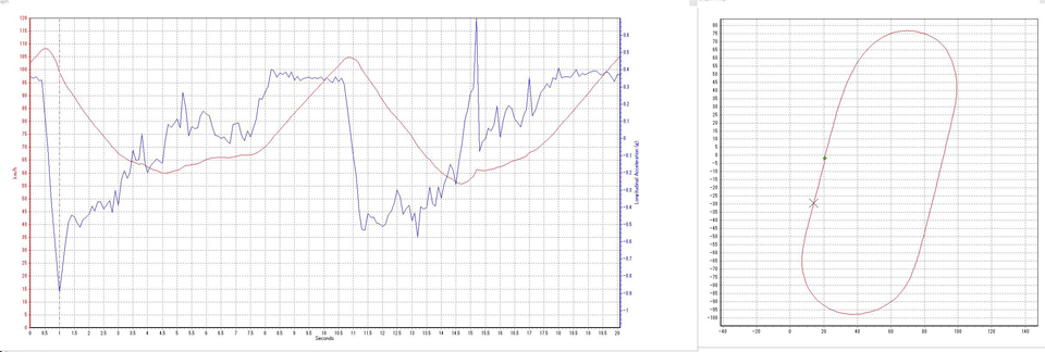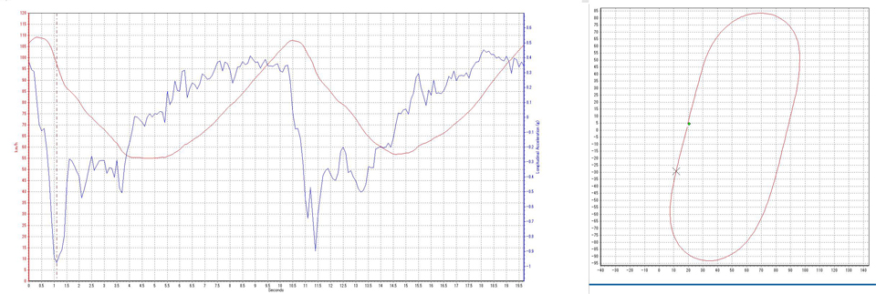 ちなみに選んだラップは2人が下のコーナーのターンイン手前で最も大きな減速Gをたたき出した周。下のふたつの図は速度と減速Gを同じ座標軸に置いた。赤いグラフが速度で左目盛、青いグラフが減速Gで右目盛。右の楕円形の線図はこの周に走った軌跡で線上の小さな緑の丸がスタート/フィニッシュライン。それぞれのX印が下のコーナー前に最大減速Gを記録した地点。図は上がSさんで下がボク。