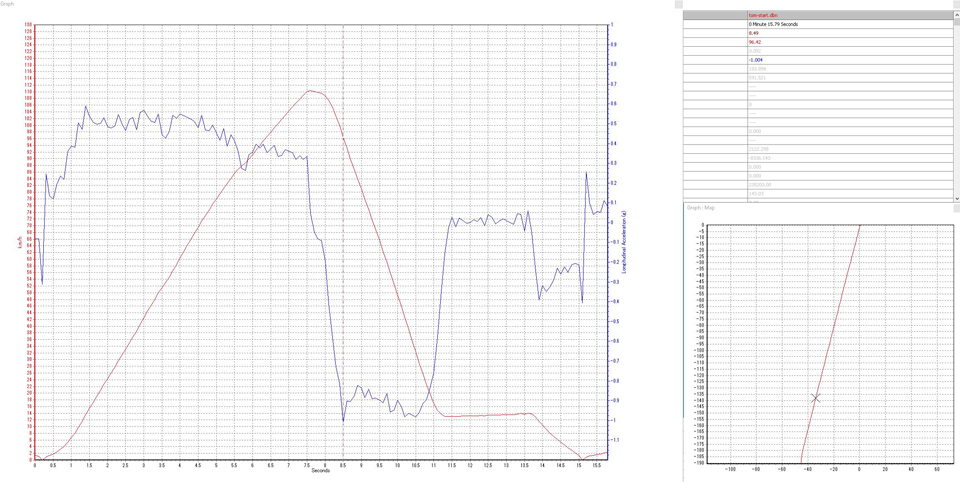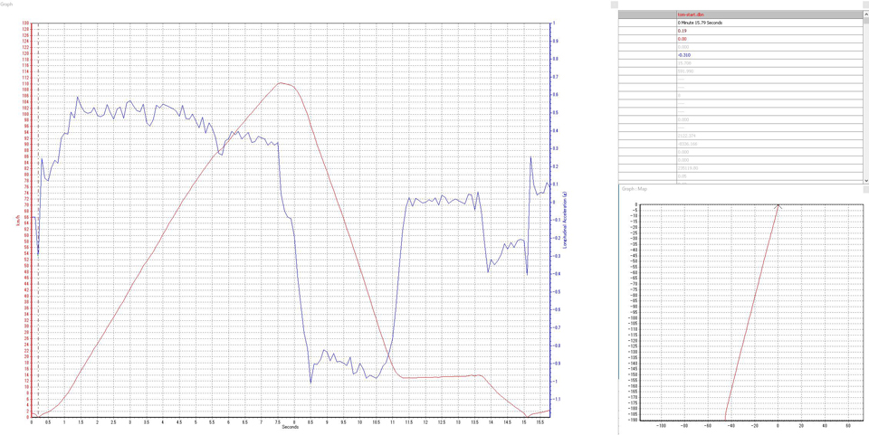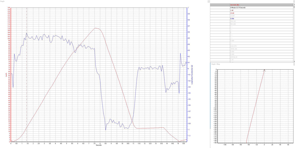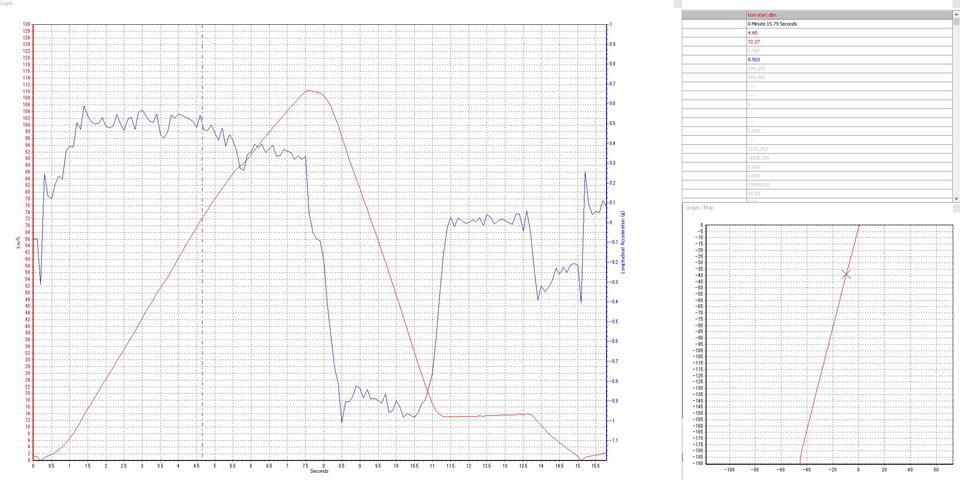 スタート後3.4秒あたりで速度の上昇によどみがある。1速から2速へのシフトアップだろう、加速度にもわずかな落ち込みが見てとれる。対して2速から3速へのシフトアップは5.3秒あたりか。こちらは動画の音声からもわかるが一瞬加速度の鈍化が感じられる。いずれにしろシフトアップ時に加速度がマイナスに振れないシームレスなシフトアップはさすがEDC。