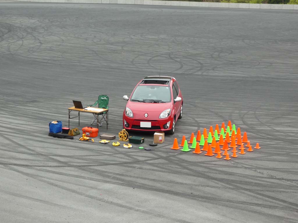 パイロン、光電管、送信器、机、椅子、パソコン、巻尺などなど。必要な機材を全て積んでもまだ余裕。トゥインゴGT大活躍の図。