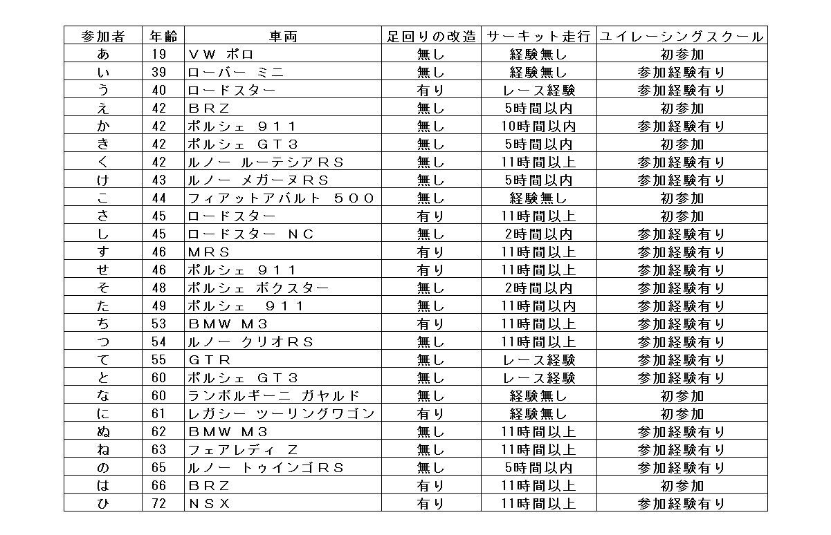 ユイレーシングスクールには様々な人がいろいろなクルマで参加してくれる。今回、どんな参加者分布だったのかを示したのが上の図。傾向としては、いつもより年齢層が若干高かったのと、クルマをいじっている人が少し多めだったこと。前述の通り初めてユイレーシングスクールを受けてくれる人が多くて嬉しかった。