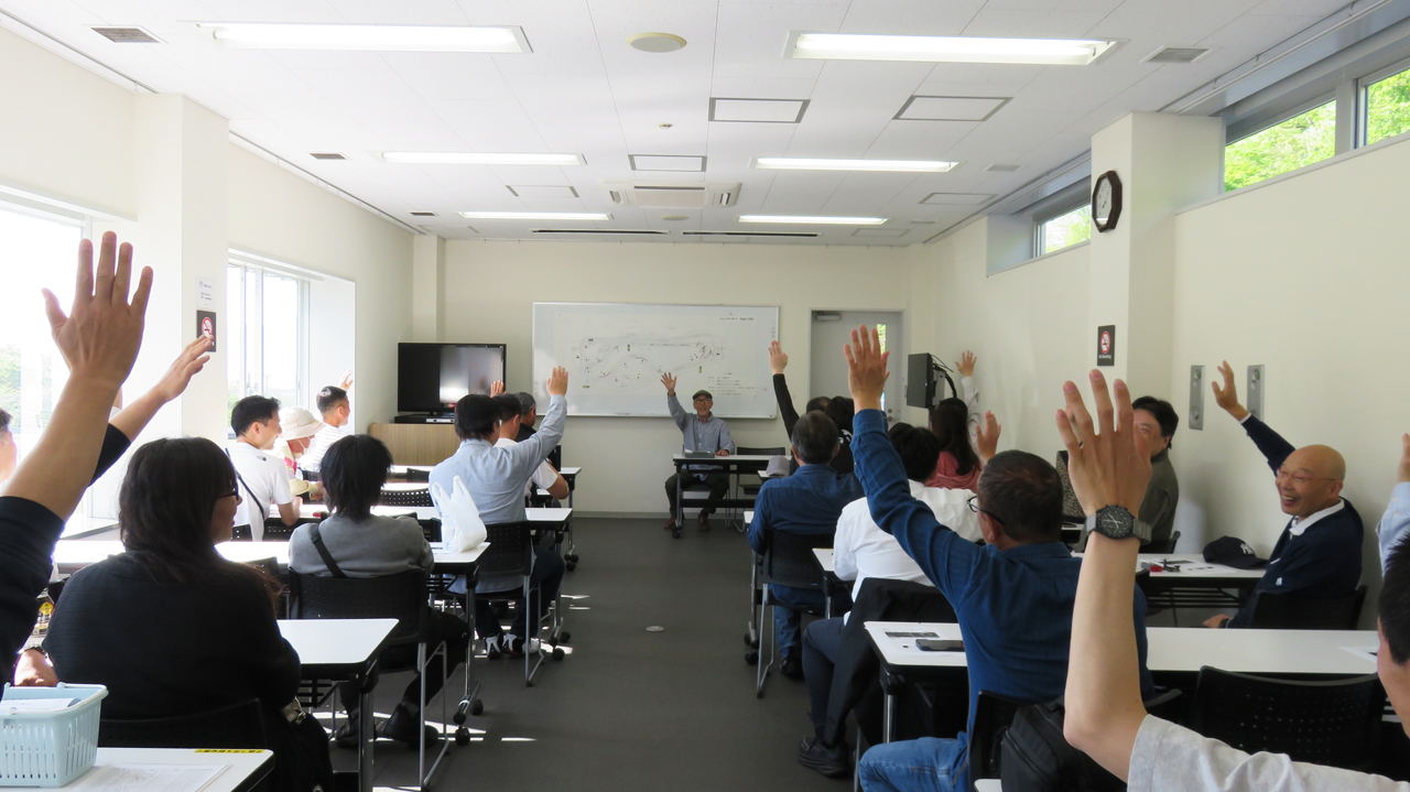 YRSツーデースクールFSWでは2日間できるだけ参加された方々と時間を共にしたいと思い希望される方はスタッフと同じ宿に泊まってもらっているのだけれど、1日目の夕食時、ロータスに乗っているIさんがこのブログで知って地アジ刺しを食べにむすび屋さんに行ったという話になって、「エ~ッ、ホント?」と聞くと「ボクも行った!」とスバルに乗っているNさんも手を挙げた。Wさん夫妻はルノー仲間になる前からスクール終了後に御殿場に宿をとりこのブログで知ったさかなや本店に飲みに行っているのは知っていたけど、他にも、「えっ、ブログ読んでくれているの!」の人がいて驚いて、ならば参加者全員が集まる2日目朝のミーティングで聞いてみようと思い立ち、座学を始める前に「ルノーのブログを読んでくれている人は手を挙げてくれますか?」とたずねたら下の写真に。