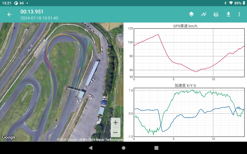 コース図上の色のついた走行ラインの始点・終点がグラフの左端・右端と対応。走行ラインの色は赤が減速で緑が加速で黄色系はその中間。グラフの赤線が速度。青線が加減速Gで緑線が横Gを表している。