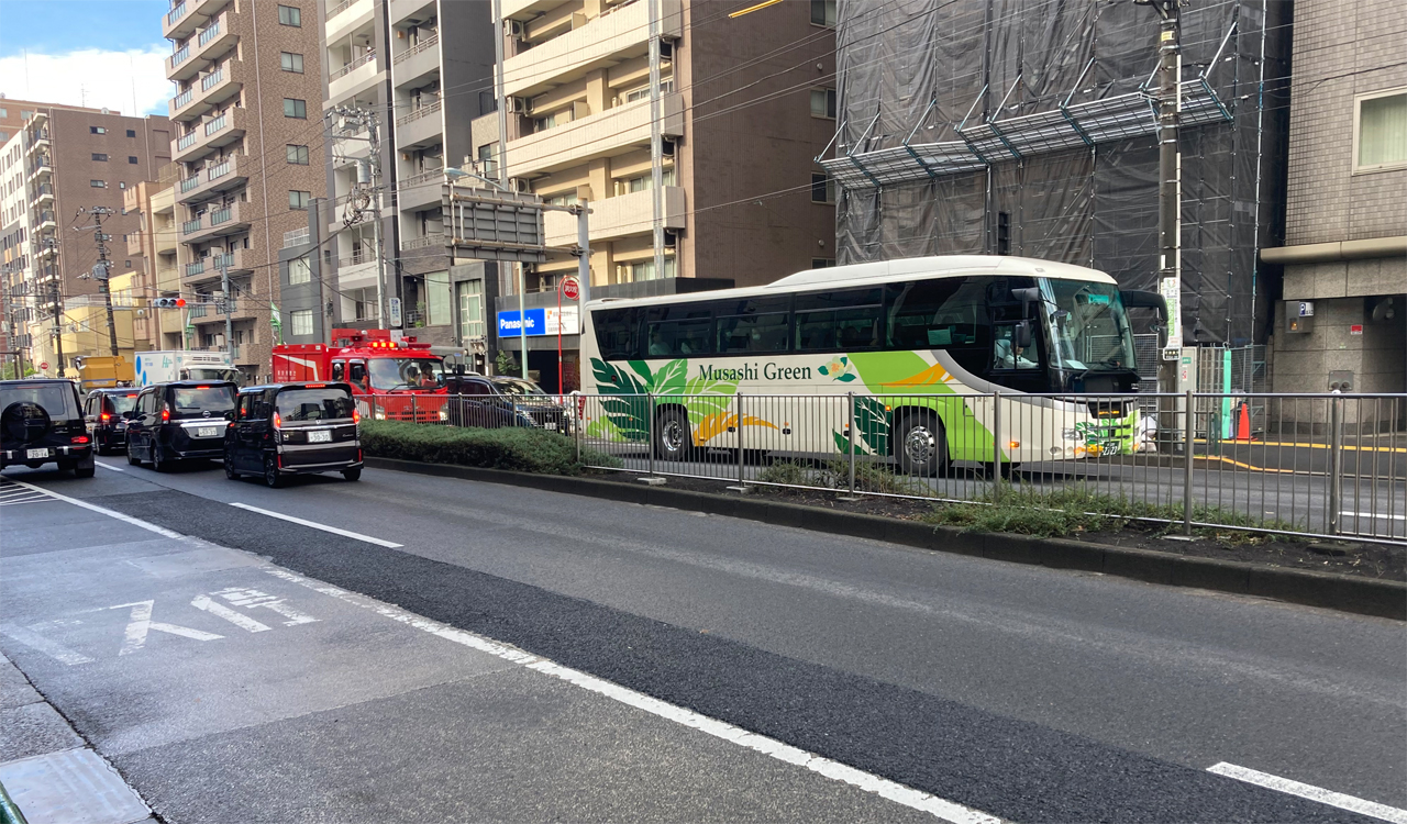 現場は2車線の交互通行。パナソニックの看板のあるあたりから中央分離帯が始まりやがて右折車線が加わる。観光バスが停まっているのは右折車線が始まる手前のところ。写真からわかるように観光バスと歩道の間が空いているから左に寄れるはずだ。前方にも前に進んで左に寄るスペースは十分にある。それなのに観光バスは微動だにしない。遠目に運転手がじっと前を見据えているのがわかる。動く気配もない。消防車に勝手に迂回していけと言わんばかりに。看板もしょっているのに観光バスの運転手は何を考えているのだ、と毒づきたくもなる。