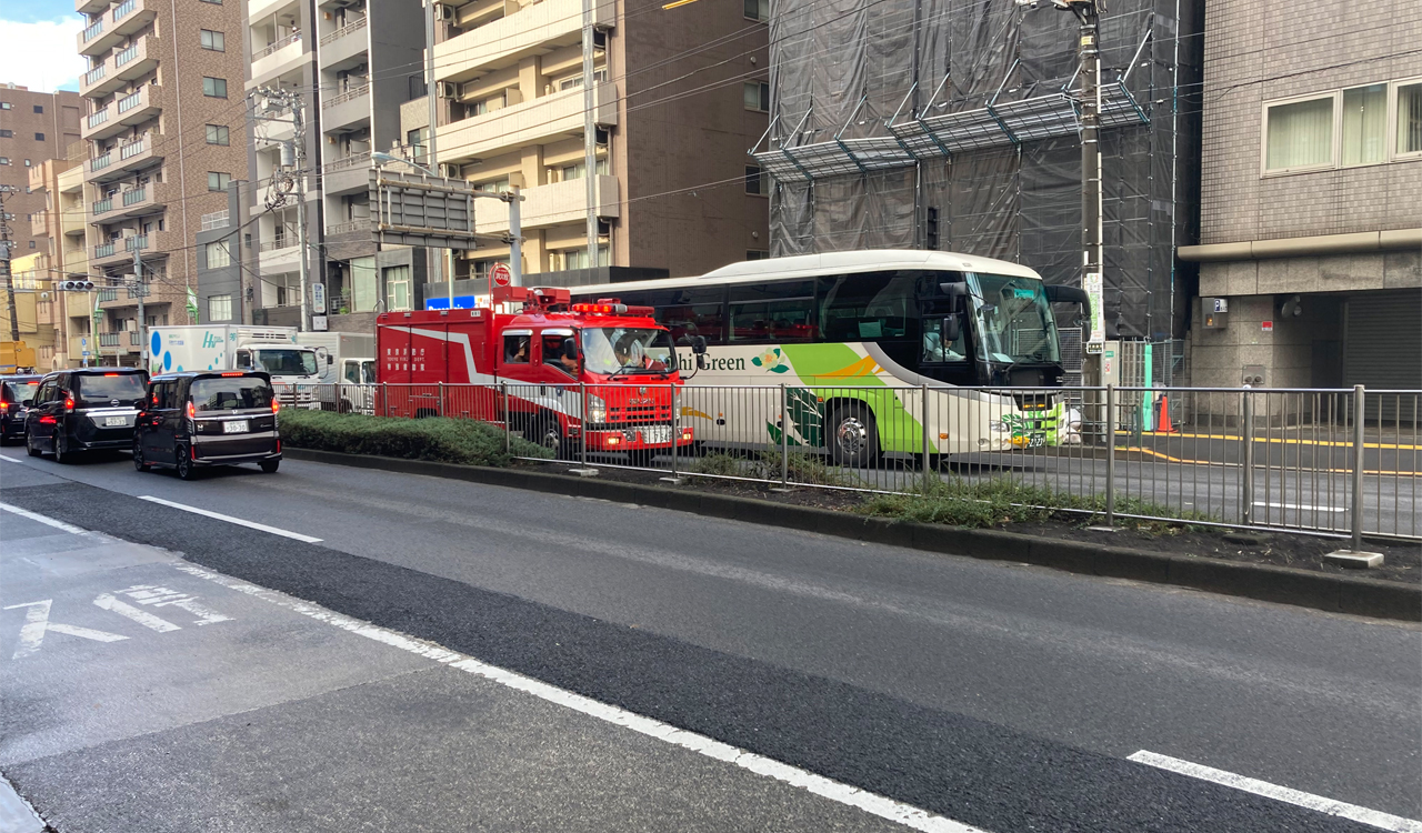 それでもようやく幹線道路が交わる交差点に近づいた時のこと。消防車が突然止まってしまった。赤色灯は赤く回っているけどサイレンは沈黙した。何が起きたいのかと振り返ると、停止している観光バスがじゃまになって消防車が前に進めない。まるで観光バスと消防車がにらみ合っているかのよう。