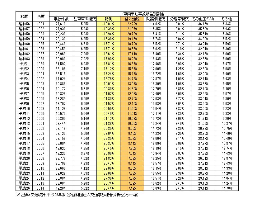 しかも、いったん単独事故が起こすと死にいたる可能性が高い、ということを、クルマを運転する人全てが意識しておいたほうがいいと思う。いささか暗澹たる気持ちでデータを更新するたび、厳に自分も戒めることにしている。