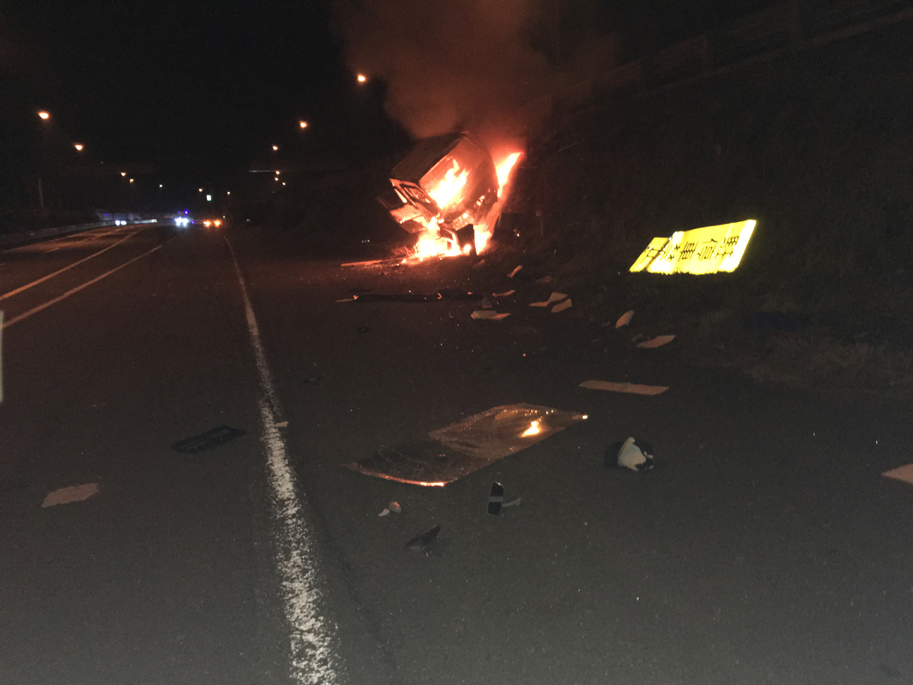 「東名右ルート75.8キロポストあたりでトラックが燃えています。2人が負傷しています。救急車、消防車は出動していますか?確認して下さい。」つい乱暴な口調になる。