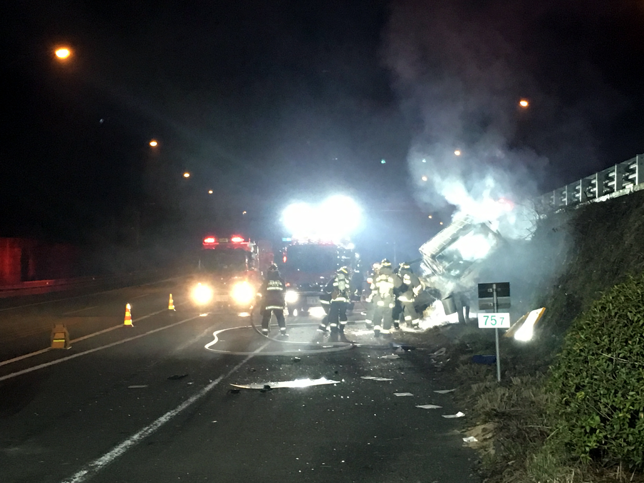 クルマを停めてから5分は経っている。通報はその前にされているという。大井松田の電光掲示板に「右ルート事故」の表示があったのだから、その時点で管理者は事故の発生を認識していたはず。それから10分は走ってきている。パチパチと音を立ててバブルキャブのトラックが燃え続けている。