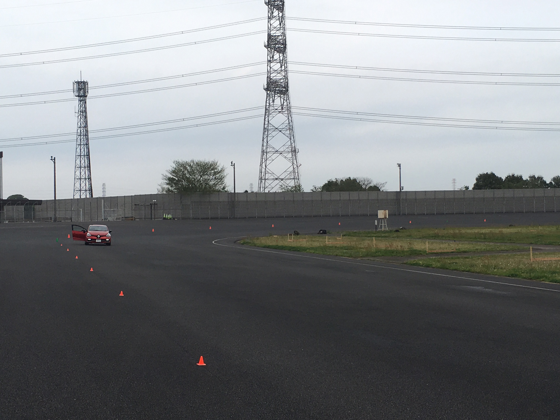 直線もコーナーもイン側の白線から13.3mのところにパイロンを並べることで、コース幅を狭くしてアウト側の曲率半径を小さくした。結果としてターンインで明確な減速が求められることになり、かつパイロンより外側に十分なセーフティゾーンを設けられた。実はアウト側白線の外側にもフラットではあるけど10mのスペースがあるので安全性は十分。