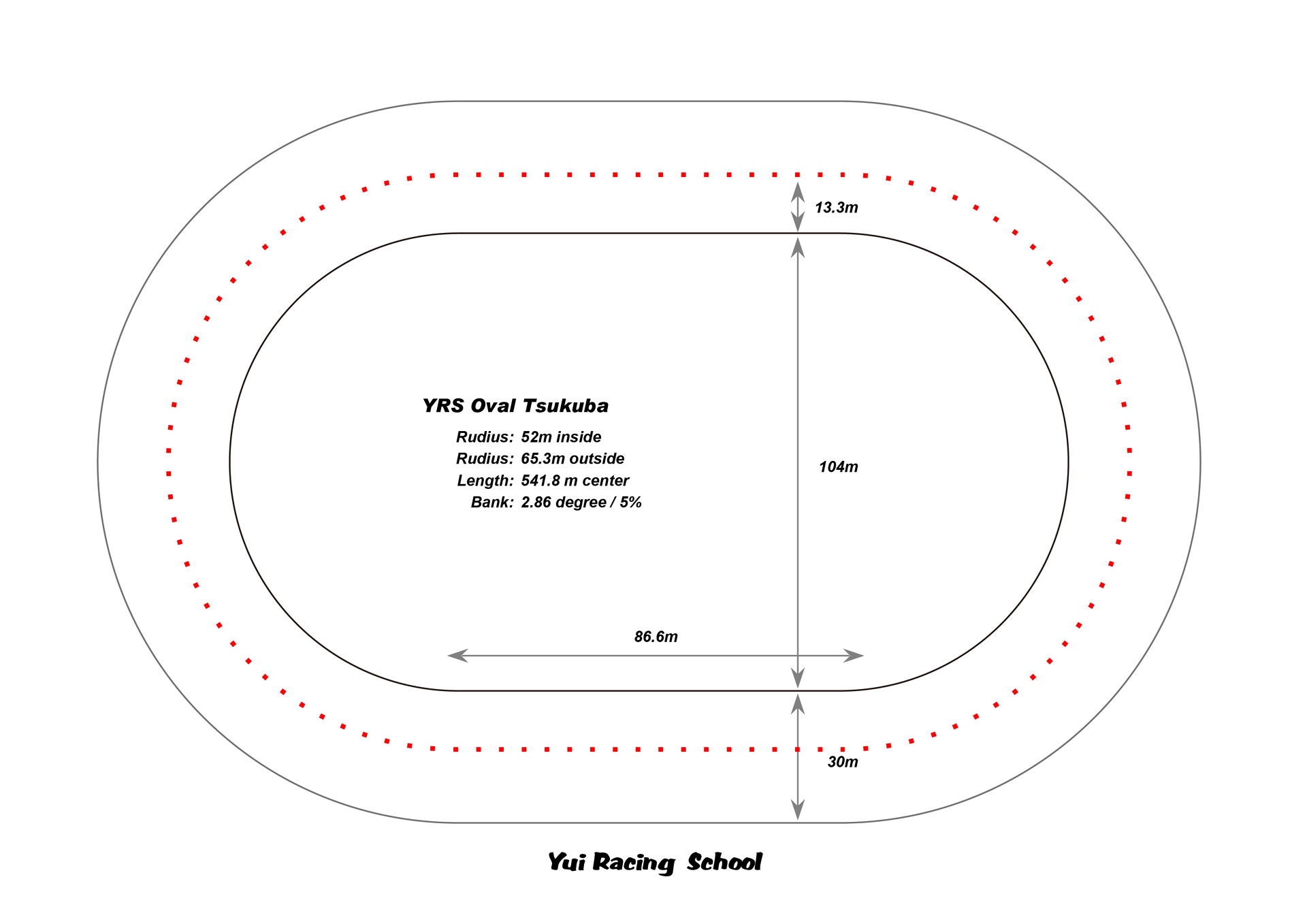 今回、筑波サーキットにあるオートレース選手養成所のコースが使えることになったので、YRSオーバルレースとYRSオーバルスクールの開催を計画した。YRSオーバルコースとしては10番目にあたる最も曲率半径の大きなコース。しかも、5%とは言えバンクつきのコースは初めて。