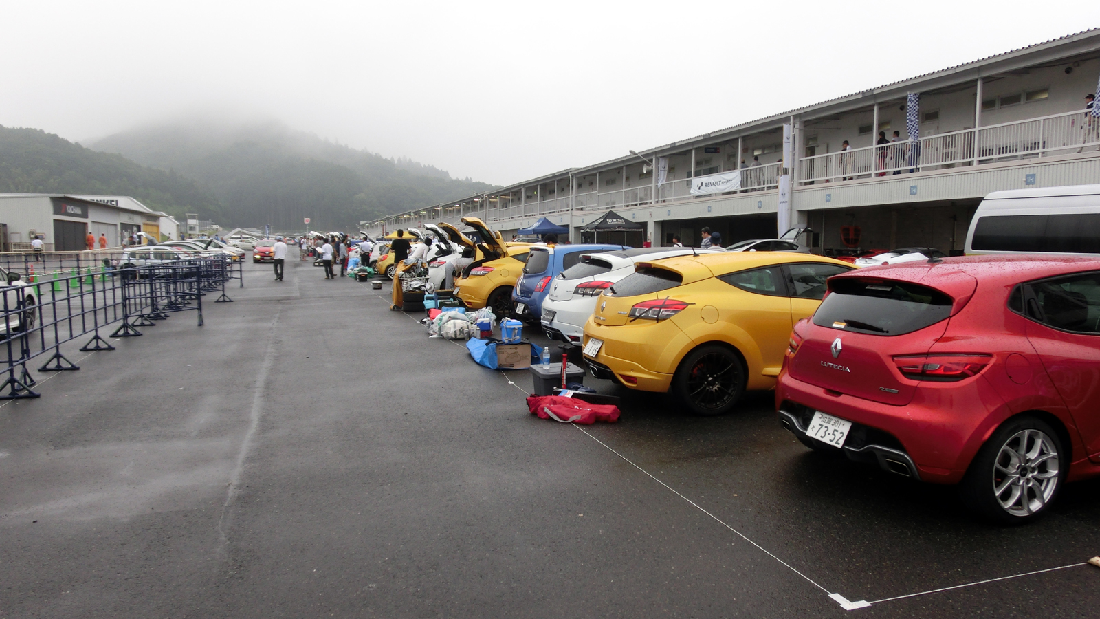 写真は雨が小降りになった6時前のルノーカップ出場車待機場所