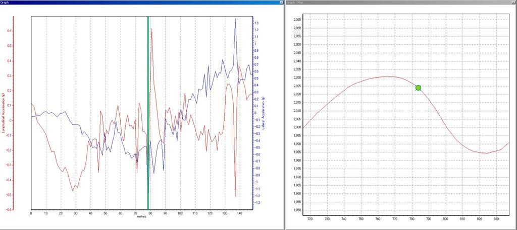 見難いかもしれないが、図は左の座標が加減速Gで赤い折れ線グラフで増減を、右の座標は横Gで青い折れ線グラフで表示している。軌跡上の緑の丸がクルマの位置、グラフの中にある緑の縦線が対応するクルマの加速度を示している。ちなみにグラフでは、加減速Gがゼロを基点に最大0.7Gとマイナス0.6G、横Gは同じくプラスマイナス1.4Gを表示している。