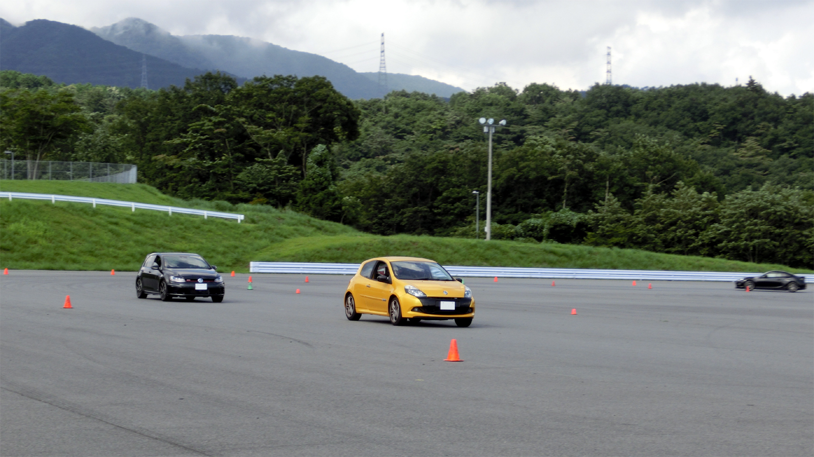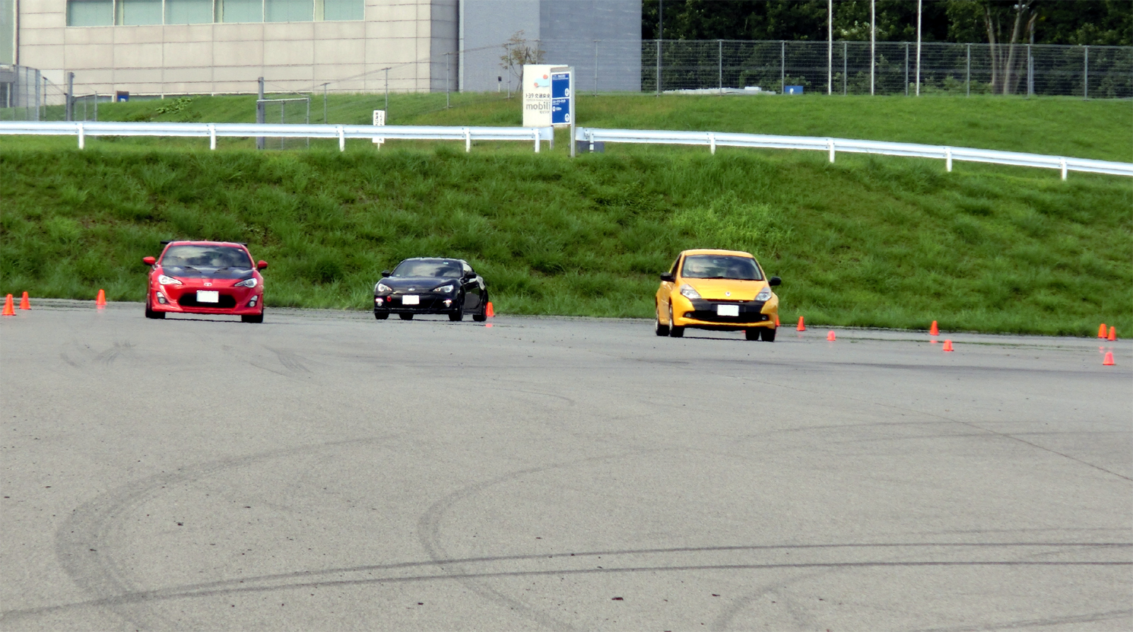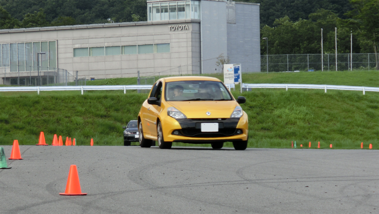富士スピードウェイ駐車場でのスラローム、ブレーキング、8の字走行の練習だ。運転テクニックの訓練なので注意点がテクニカルになるのは当たり前なのだが、細かい事にとらわれて大きな絵がみえず、総合的な運転操作としては全くバランスを欠いてしまう。はじめてやる事への緊張も大きく、アウトプットにはため息の連続だった。練習している内容とトムさんからの指示がどのような場面でいかに重要であるかは、翌日のサーキット走行で深く感じる事になるのだが、なかなか初日には実感できなかった。緊張と蒸し暑さと落胆の連続にちょっとやられてしまった初日だった。できはさておき色々考えてたくさん走った。