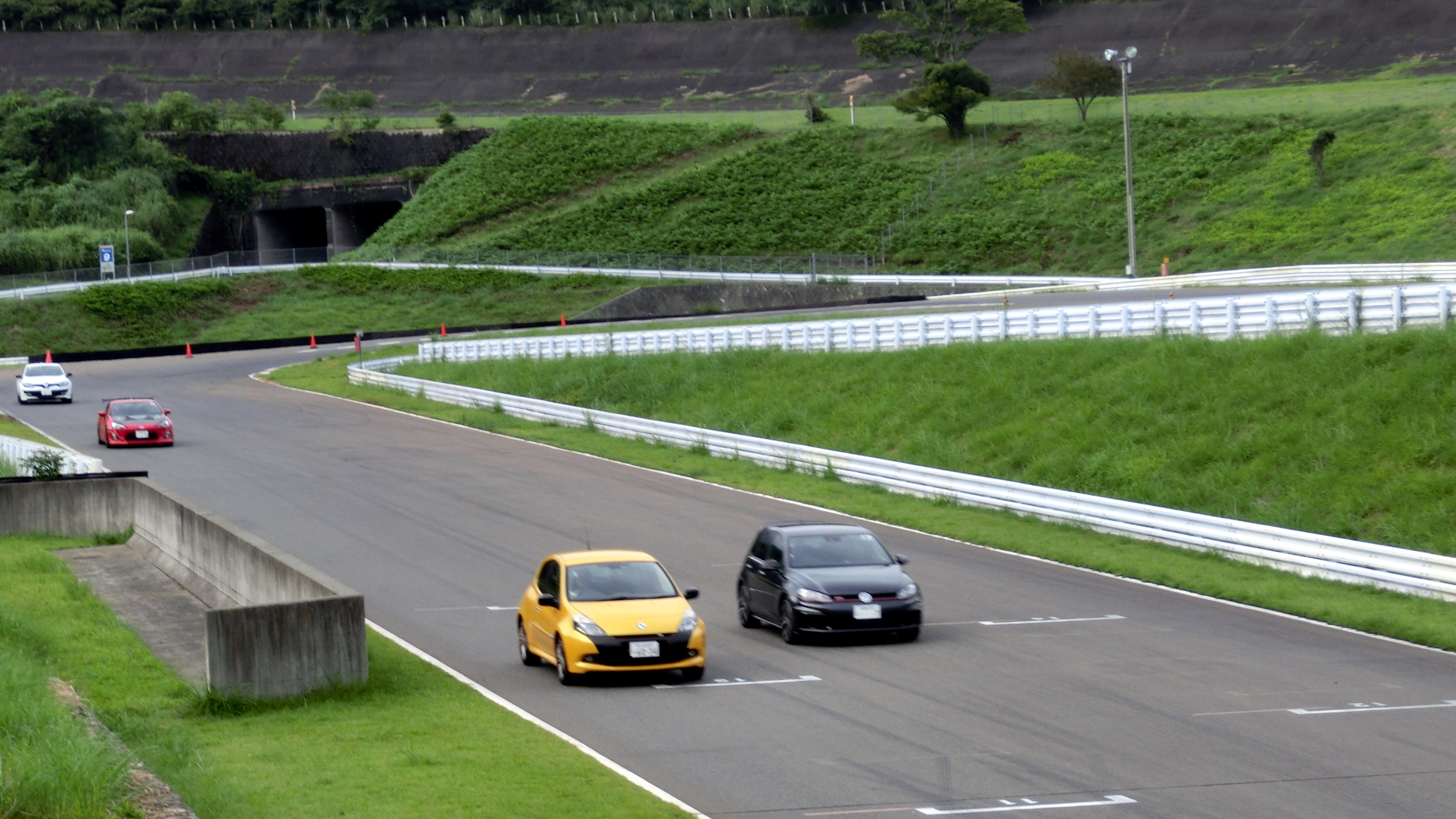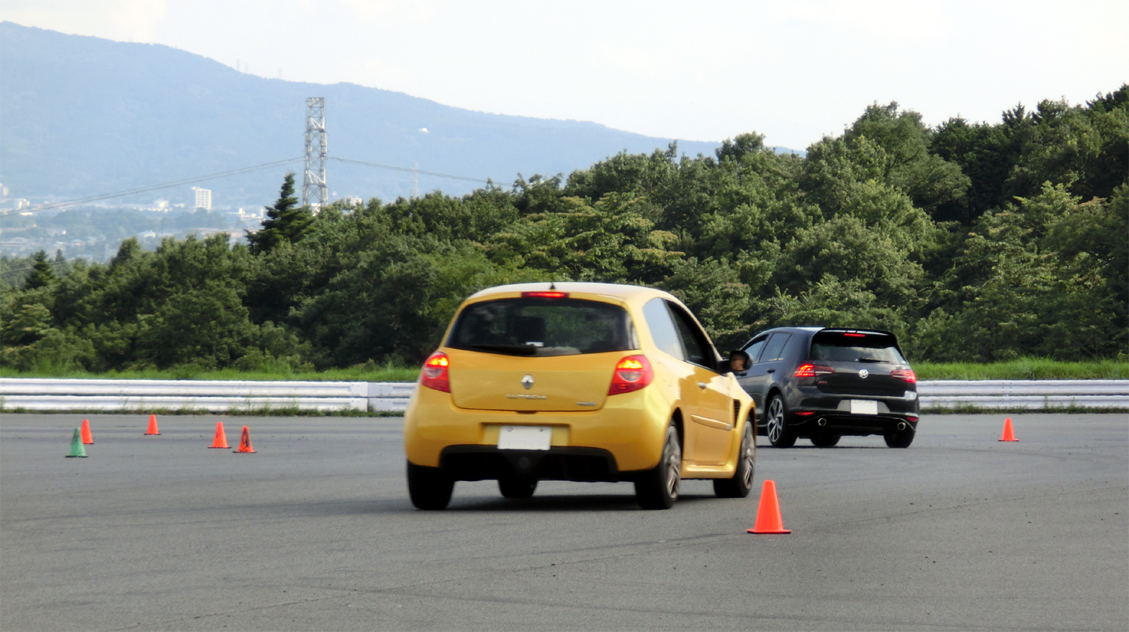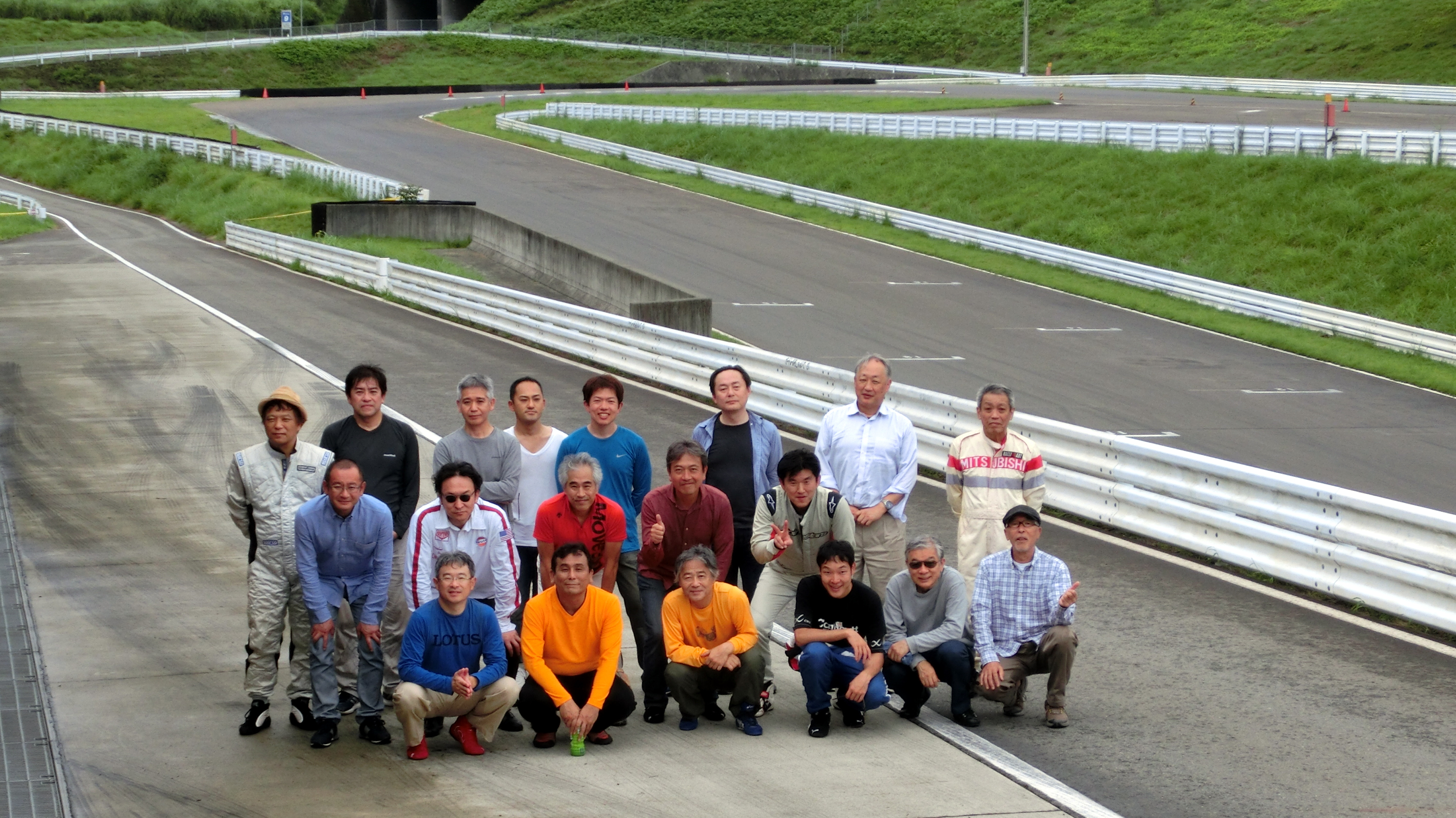 富士スピードウェイ駐車場でのスラローム、ブレーキング、8の字走行の練習だ。運転テクニックの訓練なので注意点がテクニカルになるのは当たり前なのだが、細かい事にとらわれて大きな絵がみえず、総合的な運転操作としては全くバランスを欠いてしまう。はじめてやる事への緊張も大きく、アウトプットにはため息の連続だった。練習している内容とトムさんからの指示がどのような場面でいかに重要であるかは、翌日のサーキット走行で深く感じる事になるのだが、なかなか初日には実感できなかった。緊張と蒸し暑さと落胆の連続にちょっとやられてしまった初日だった。できはさておき色々考えてたくさん走った。