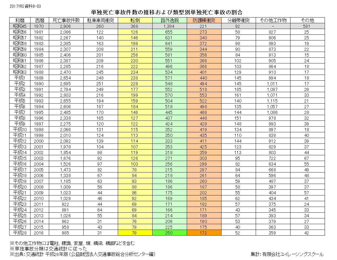 表を見てもらえばおわかりいただけると思うが、近年、交通事故件数、単独交通事故件数、死亡事故件数、交通事故死者数が減少傾向にあるのに、交通死亡事故件数に対する単独交通事故件数の割り合いは増加、もしくは高止まりという。