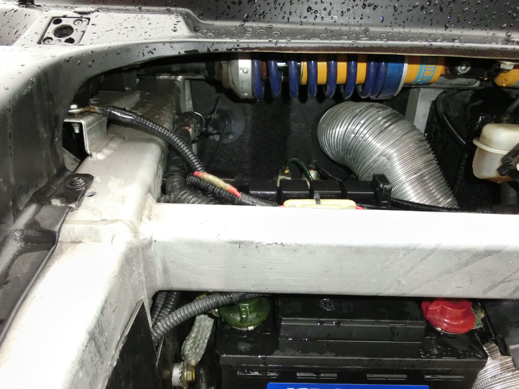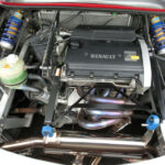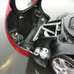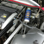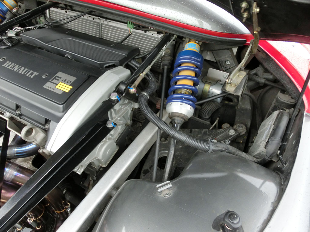 アフターマーケット品なのかタコ足が魅力的なエンジンベイ。左右にプッシュロッド入力を受けるコイルユニットとドライバーが背中に背負うであろうラジエターが見える