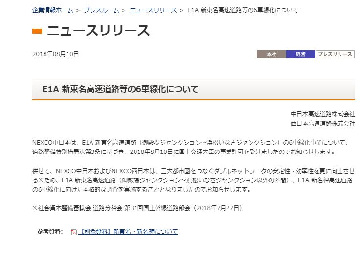 8月10日。中日本高速道路株式会社が次のようなリリースを出した。