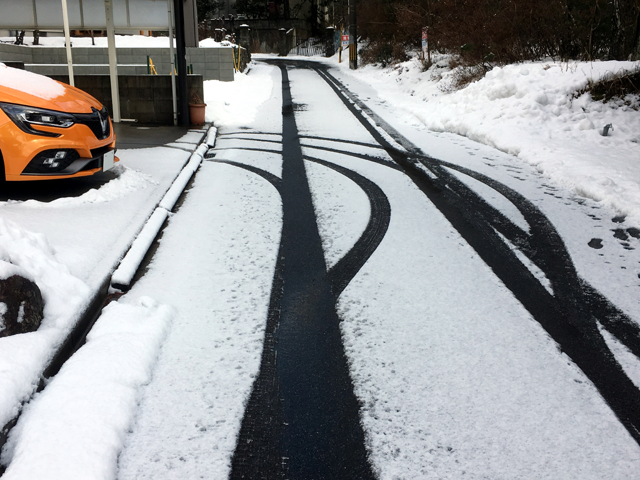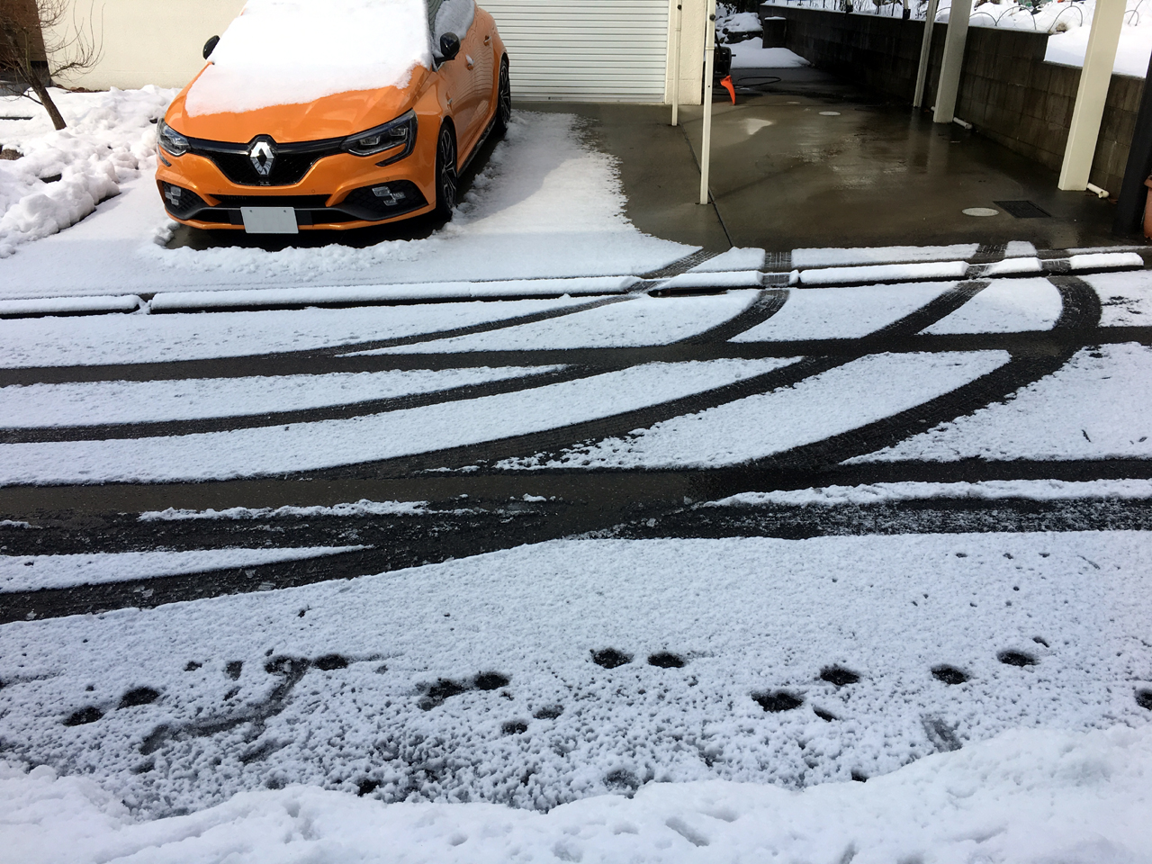 写真は、冬季につけるカーポートの支柱を避けながら自宅前の4m道路に出したフィットに履かせたスタッドレスタイヤの軌跡。思いもかけぬステアリングワークの教材が出現。