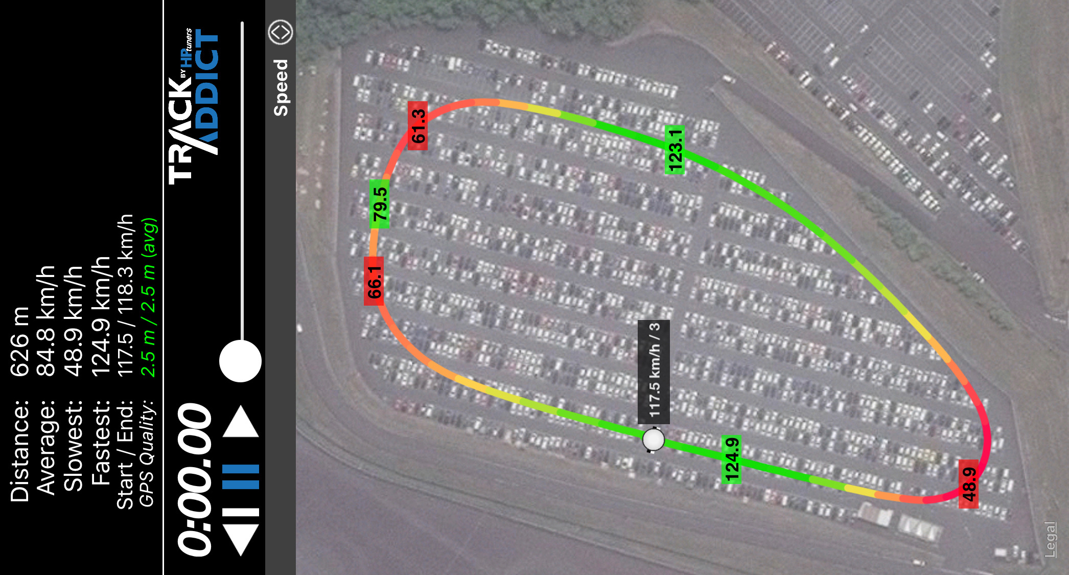 何ヒートかやったところで、ポルシェ911に乗る常連のIさんがどうやって走るか見せてほしいと言ってきた。滑りやすい路面でのブレーキペダルの踏み方と、ターンインの時に前後輪の荷重が均等になっているか確認したいと言うので、何周かしてみた。下の画像は、Iさんのクルマに取り付けられていたスマホのアプリに記録された走行データ。なんでも、走行ラインで真っ赤になっているところは横Gが1.1を超えている区間だとか。ベストタイムは25秒5。