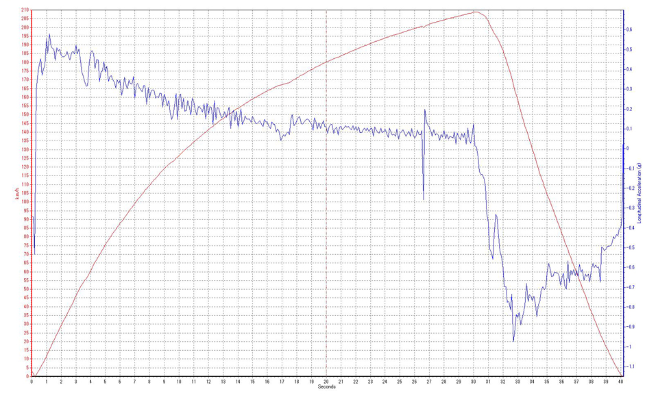 (グラフは赤線/左スケールが速度で青線/右スケールが進行方向加速度)