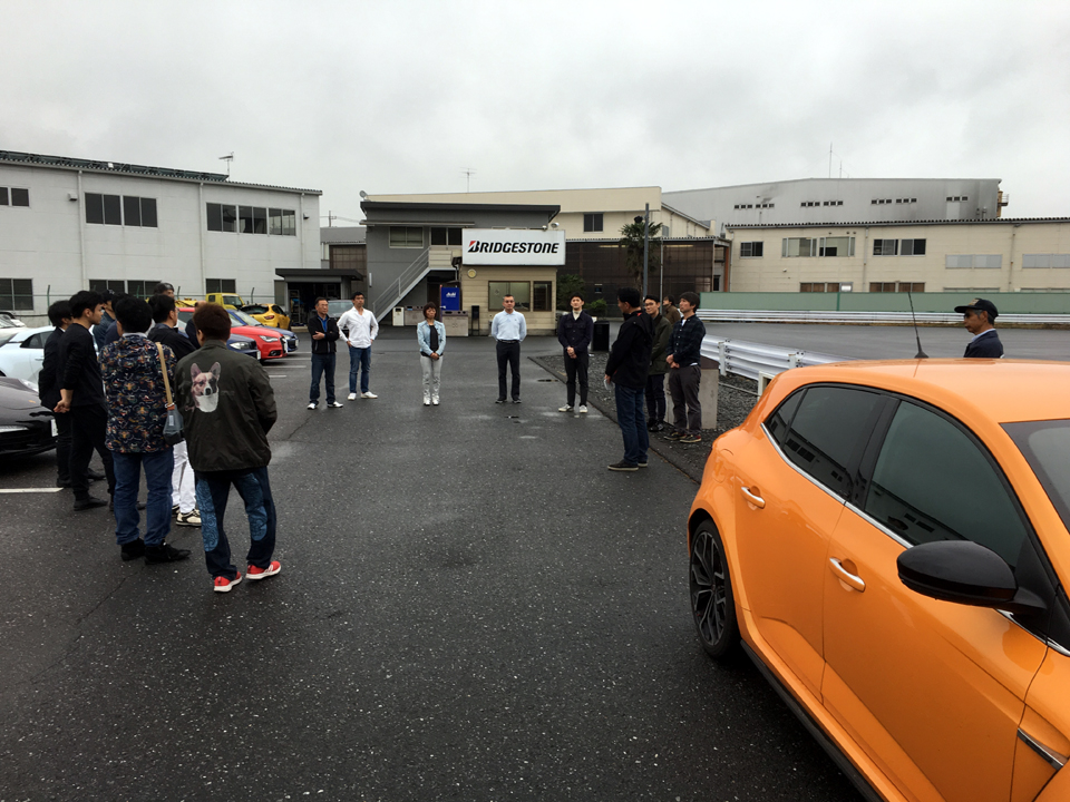 間際にキャンセルが相次ぎ、この日集まったのは最年少25歳、最年長75歳、平均年齢52歳の23名。うち11名がエンジンドライビングレッスン初参加。ということは、午前中に行うオーバル走行も初めてで、濡れた路面に少しばかり暗い顔。