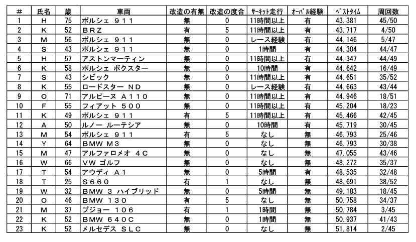 コース1000ではバンライド、リードフォロー、同乗走行を繰り返し、リピーターはレベルアップを果たし、初めてサーキットを走る人もそれなりにクルマの性能を発揮できるように。午後2時~4時に3グループに分けた計測セッションをやったのだけど、最も走った人は52周。75歳の青年も50周を走破してこの日のベストタイム。